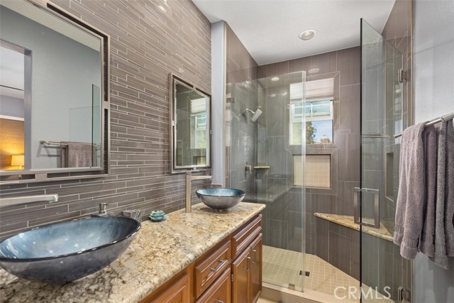 Berkshire end unit Townhome. This home is 1,632 square feet with 3 Bed/2.5 Bath. As you enter the home you will enjoy the light luxury vinyl hardwood floors all thru-out, a spacious kitchen with granite counters and full back splash, stainless steel appliances, including refrigerator, and designer style wood cabinetry. Designer style wood shutters in all the windows. Spacious master bedroom and bathroom have with an over sized shower with designer style fixtures and beautifully laid stonework through out. Custom paint and plush carpet are in all bedrooms with the continuation of the light luxury vinyl hardwood floors thru the hallway and laundry areas. Washer/dryer also included. The secondary bedrooms offer plenty of space with mirror closet doors each with private access to the shared rear balcony. The home is walking distance to Founders Park with concerts in the park and Fourth of July festivities. Also walking distance to Ladera Ranch Elementary. Close to all of the community amenities that the Ladera “Lifestyle” has to offer. This townhome is a must-see!