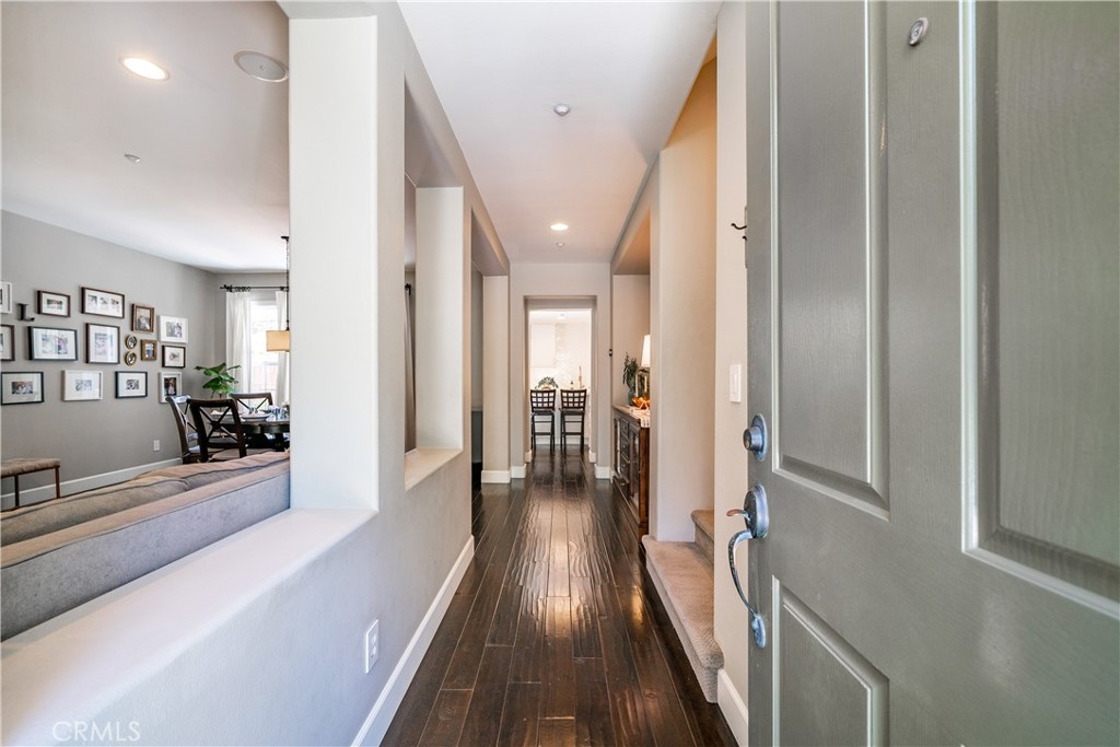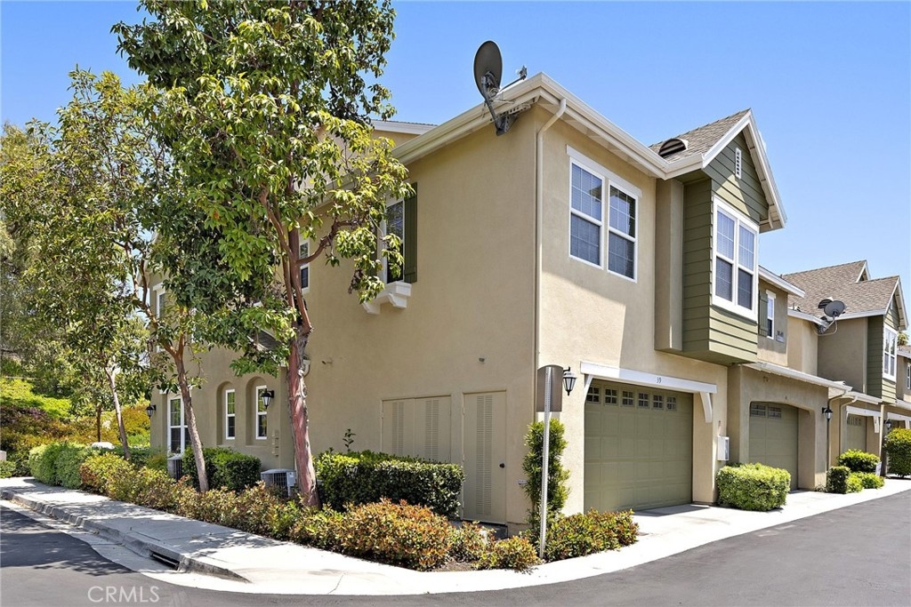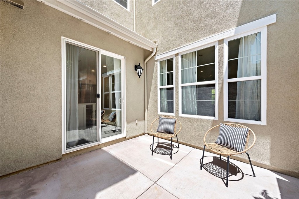 Nestled in the heart of Terramor Village in Ladera Ranch, this inviting 3 bedroom + loft, 2.5 bathroom home offers a serene retreat amidst picturesque surroundings. Step through your own private, porch enveloped by lush landscaping, ideal for unwinding with loved ones. Upon entry, revel in the allure of the upgraded engineered wood flooring through the first floor. The living room beckons with its cozy fireplace and ample natural light filtering through upgraded window shutters and blinds. A spacious dining area sets the stage for intimate gatherings. The kitchen presents a chef's haven, boasting pristine stainless steel appliances, stylish quartz counters, farmhouse sink, subway tile backsplash and updated shaker cabinets. This beautiful townhouse also features a 2 car garage, new water heater, upgraded window casings, built in entertainment center, private balcony off the primary bedroom, new garage door opener, natural gas hook up on the patio, overhead JBL speakers in the living room. Steps from nearby Oso Grande Elementary, skate park and aquatic park.