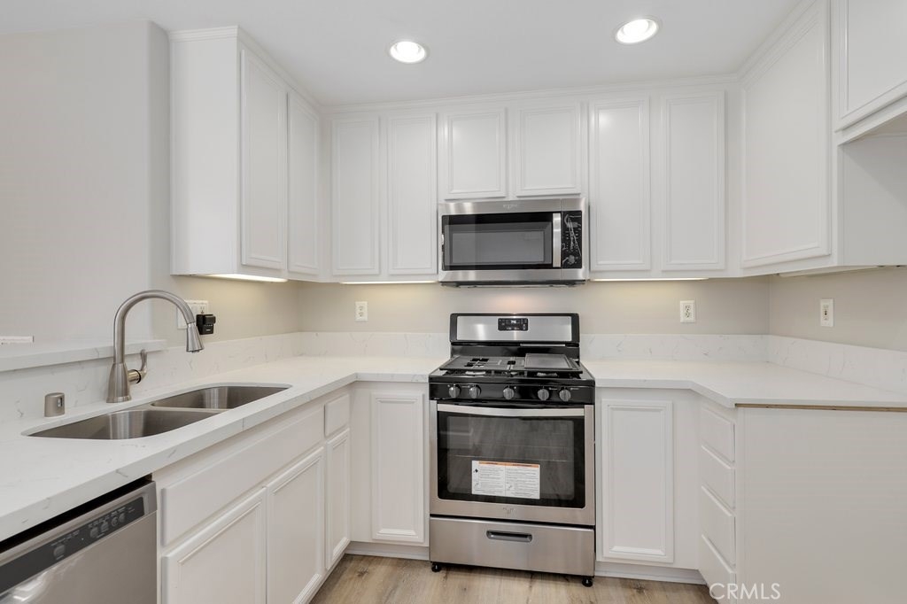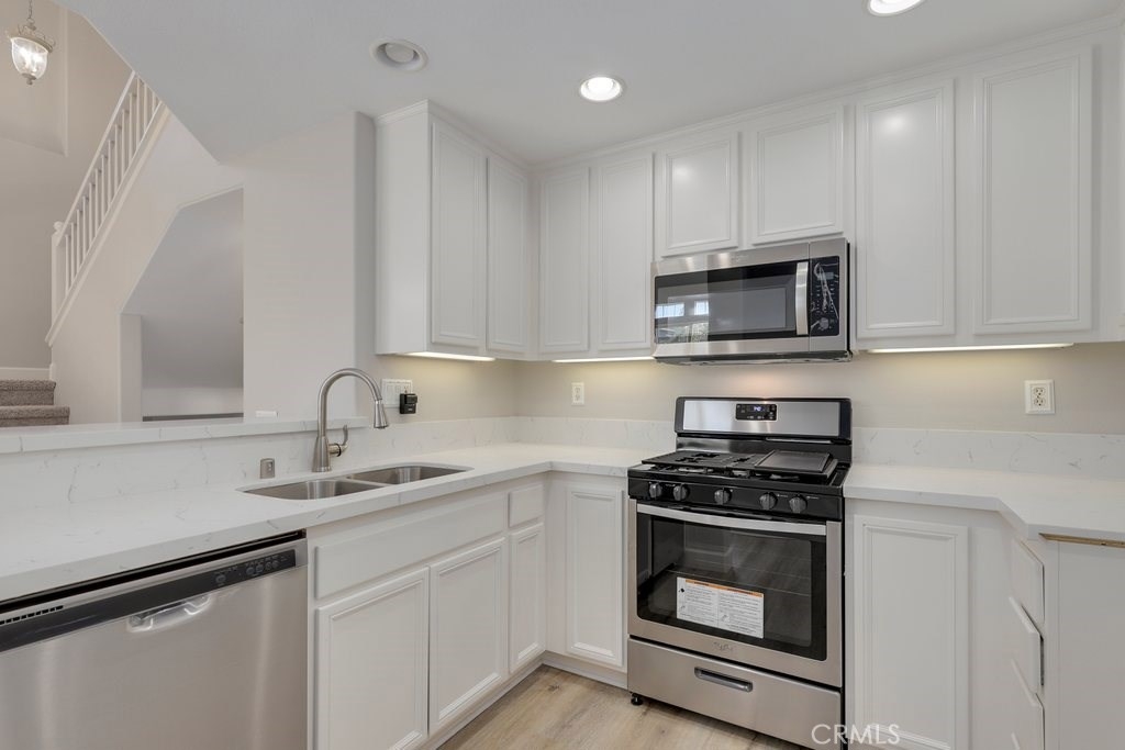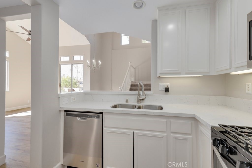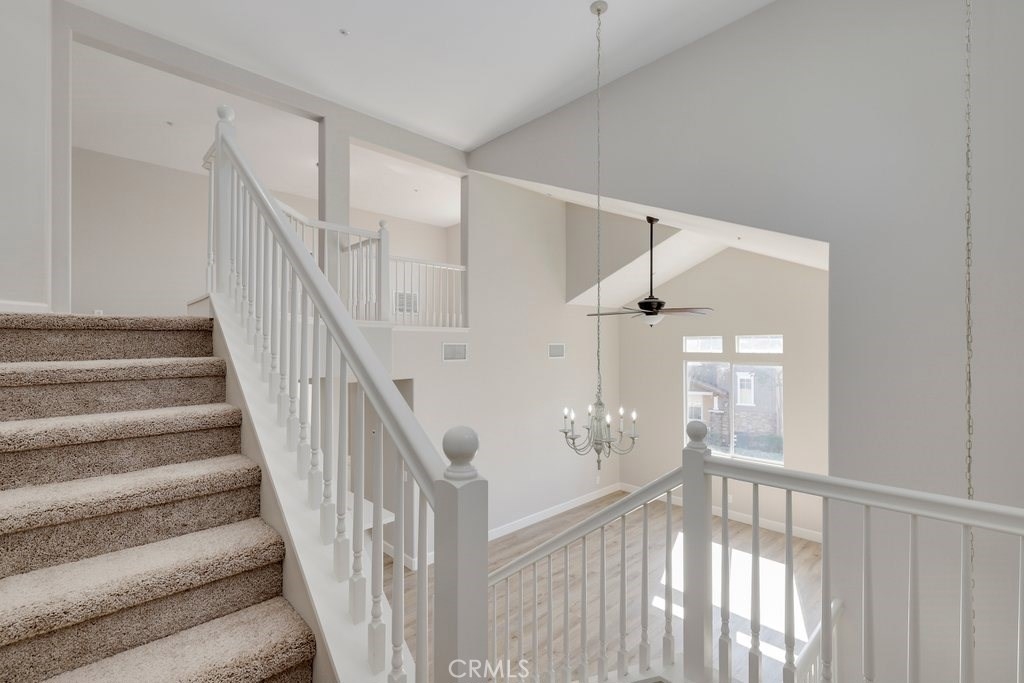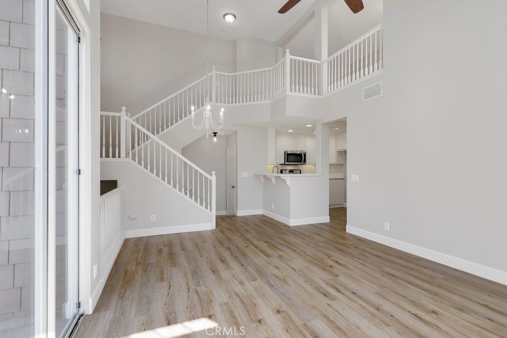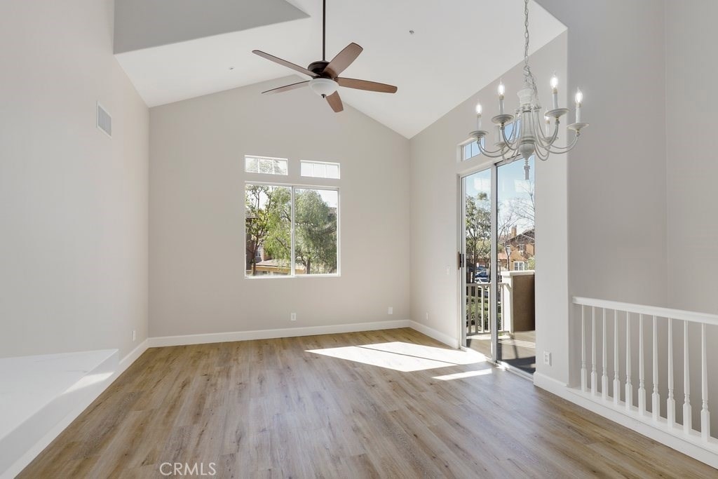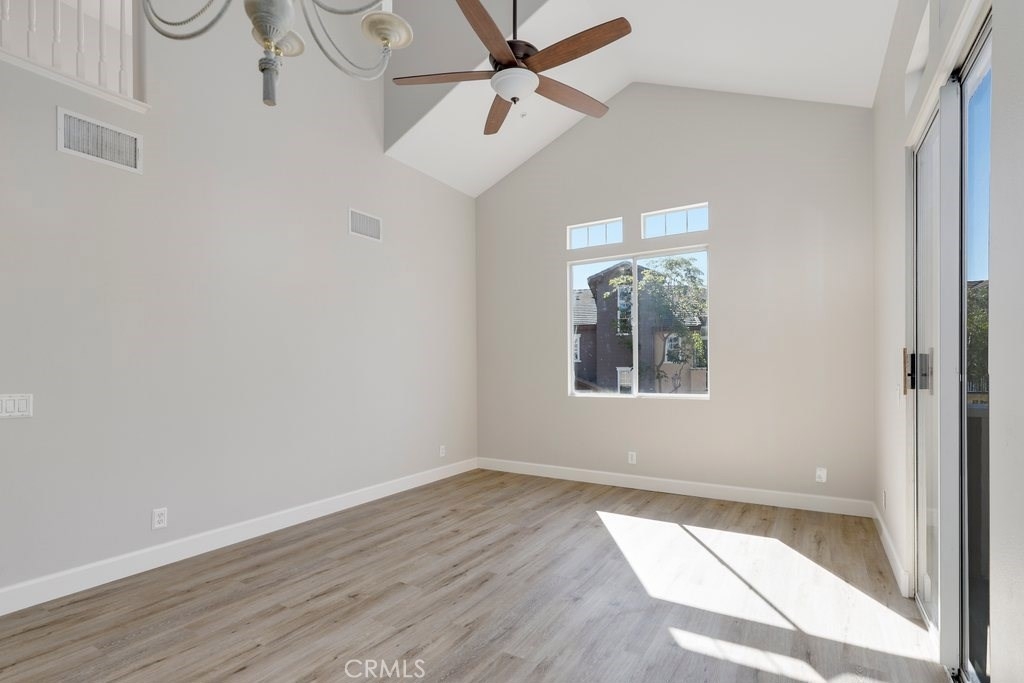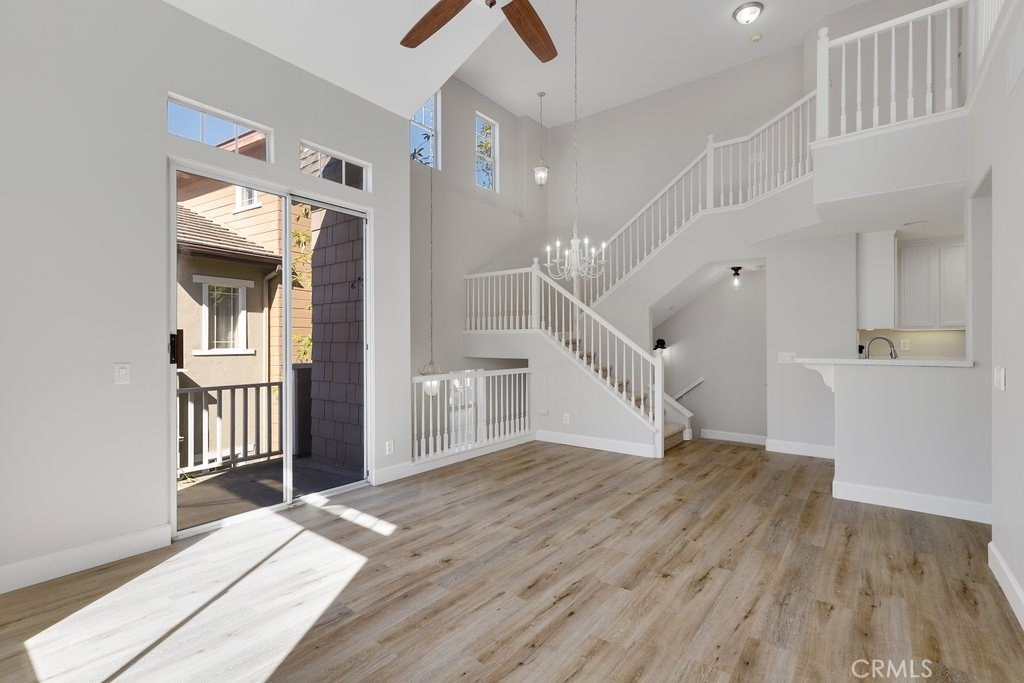 This upgraded tri-level home in the desirable community of Chambray in Ladera Ranch is ready for its new owners! New laminate wood floors, new paint and cathedral ceilings compliment the bright and open floor plan. The kitchen on the main level features fresh white cabinets, quartz counter tops, new appliances, and recessed lighting. The living/dinning room flows seamlessly from the kitchen and features a light catching slider to a private patio and ceiling fan. Down the hall the master suite features new paint, walk in closet and updated en suite master bath with dual sinks. The secondary bedroom is a generous size and shares the full hall updated bath. The third level is a huge loft with plenty of room for entertaining. Indoor laundry and attached 1 car garage in addition to one assigned parking spot make for easy living. Relax on the private balcony with neighborhood views. Enjoy the resort-like amenities of Ladera Ranch which includes high-speed internet, 15 pools, splash parks, a skate park, community garden, clubhouses and hiking and biking trails. Also enjoy concerts in the park, parades, 4th of July fireworks, a spring fair, family campout, holiday tree lightings, and a secure dog park.