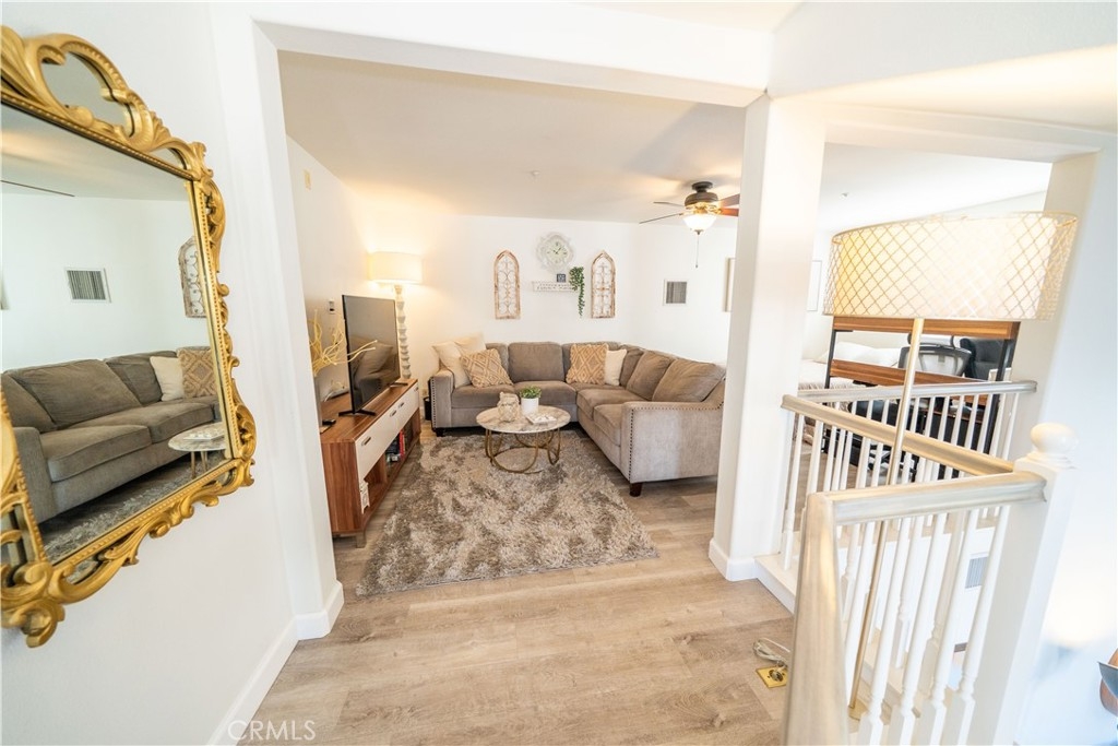 Welcome home to this beautifully appointed end-unit property in Ladera Ranch's coveted Chambray community, offering a bright, airy floor plan highlighted by soaring two-story ceilings and abundant natural light. This lovely home features two spacious bedrooms and two full bathrooms, along with a generous loft that can easily be converted into a third bedroom, home office, or private retreat. The upgraded kitchen showcases new fixtures, modern appliances, a stylish backsplash, and refreshed countertops, all complemented by a convenient breakfast bar with seating. The spacious dining area flows effortlessly into the family room, where sliding doors open to a private balcony - an ideal spot to unwind. New wood-laminate flooring carries throughout the home, enhanced by upgraded baseboards and fresh paint for a clean, cohesive look. The generous primary suite offers a serene retreat with its own well-appointed bathroom and walk-in closet. A comfortable secondary bedroom is perfect for family or guests, while the upstairs loft provides a versatile space for added privacy, a home office, or a game room. The attached garage includes a built-in water softener and convenient in-unit newer washer and dryer. In addition to the private one-car garage, the home also comes with an assigned parking space located directly in front of the unit - space #9. Beyond its close proximity to top-rated schools, shopping, entertainment, and convenient freeway access, this home is part of the vibrant Ladera Life community, offering resort-style amenities including 13 sparkling pools, a water park, disc golf, tennis and pickleball courts, a skate park, and multiple splash pads. Don’t miss the chance to tour this beautiful home, book your appointment today!