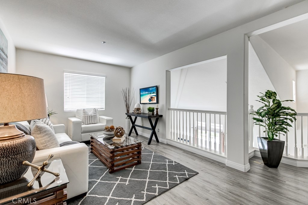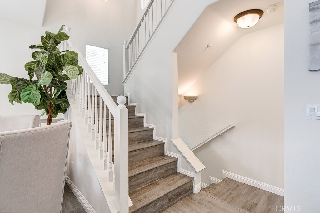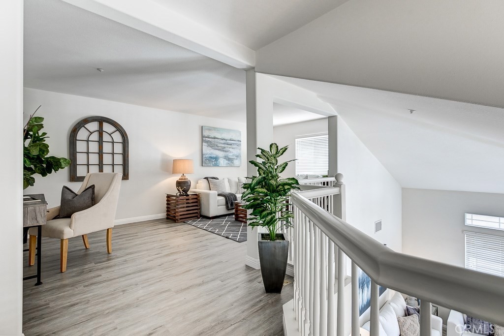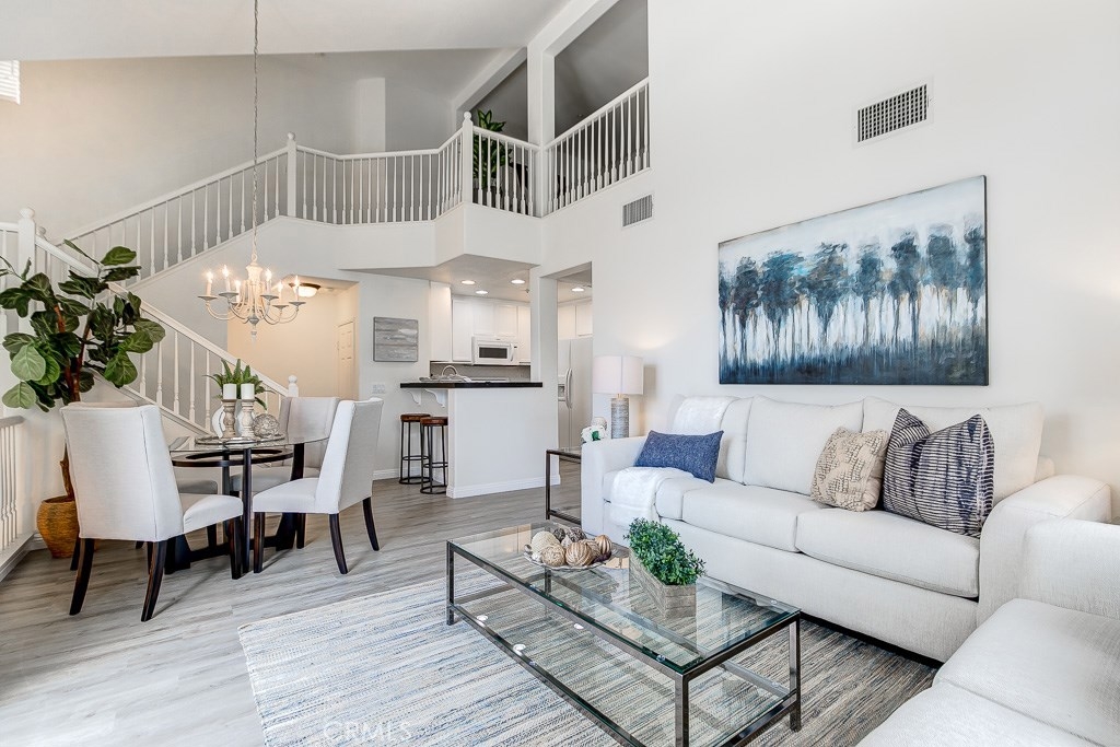 Bright and Beautiful end-unit Townhome with Attached 1-Car Garage in the delightful community of Chambray Ladera Ranch, features 2 bedrooms, 2 bathrooms + large upstairs Loft. Upon entering a lovely Great Room feel and vaulted ceilings connect the Kitchen, Dining and Living Rooms. Make a special meal for loved ones in the updated kitchen with clean white cabinetry, breakfast bar, sparkling black quartz countertops, & a large farm sink. Share your time and your meal in the charming dining space, then relax in the open family room or take the moment out onto your private balcony. New wood-look laminate flooring flows seamlessly throughout the home as well as upgraded baseboards & fresh paint—all offering you added visual appeal. The spacious master bedroom is the perfect retreat for a night of rest & relaxation with its own generous master bathroom and walk-in closet. The second bedroom is comfortable and perfect for family or guests. The upstairs Loft adds the perfect space for privacy, an ideal office environment, or would even make a wonderful Game room. Welcome Home!