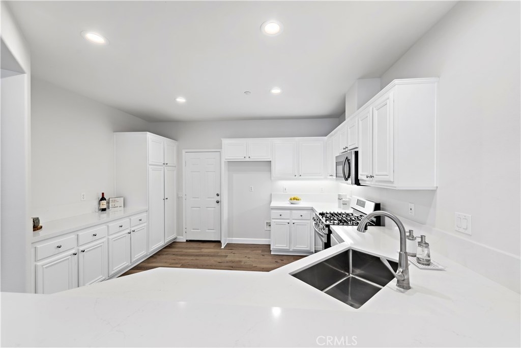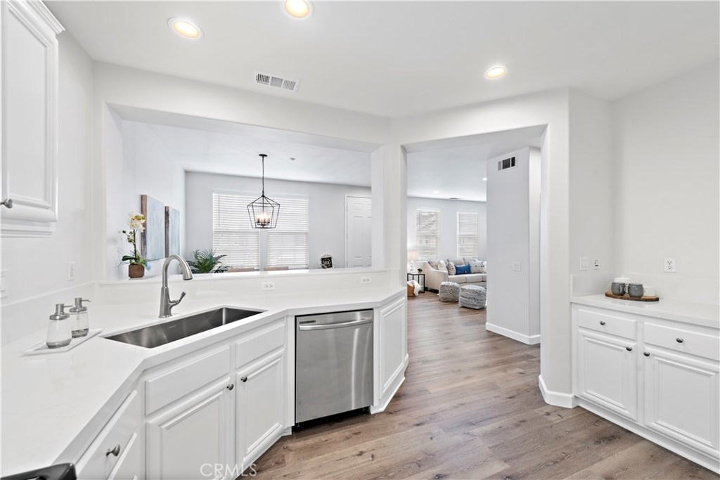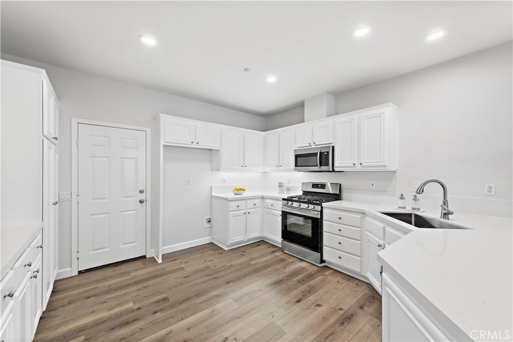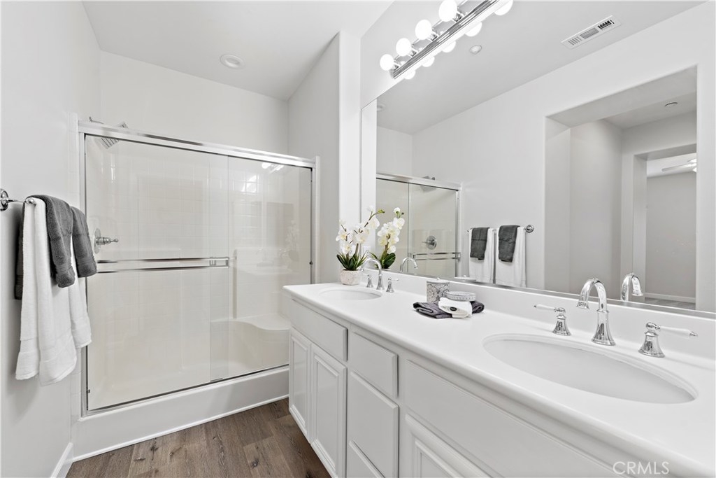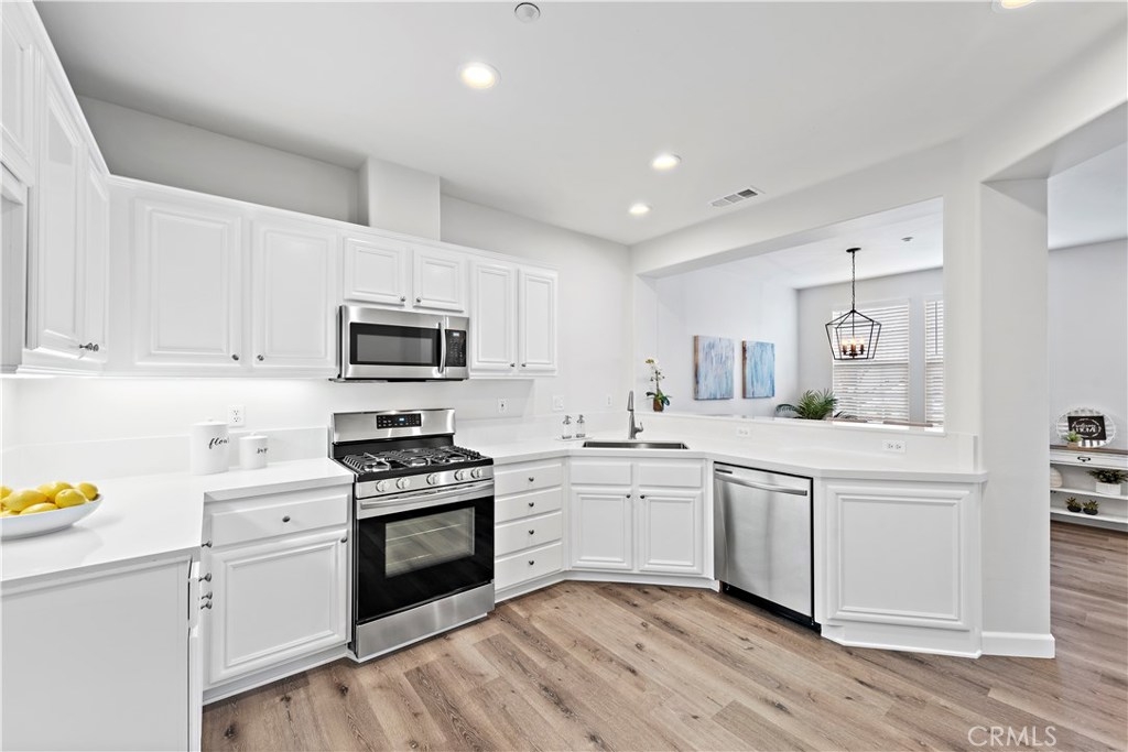 Perched on a higher elevation, this stunning 3 bedroom, 2.5 bath home provides privacy, and interior designer upgrades, and is centrally located to Community activities, schools, numerous parks and pools. Front porch entry and patio is perfect for relaxing or entertaining, featuring flagstone finishes, planters, and white picket fence. Spacious open floorplan greets you upon entry w/ brand new luxury plank flooring throughout the downstairs, upgraded baseboards throughout, recessed lighting. Open Living room w/ beautiful custom built-in Entertainment Wall, fireplace w/ marble and stacked stone surround. Large Dining Room w/ upgraded chandelier. Spacious Gourmet Kitchen w/ brand new Quartz Counters, Breakfast Bar, Large Single Basin Sink w/ upgraded Faucet, Refinished White Cabinets, Brand New Stainless Steel Appliances, abundance of cabinets, and pantry. Upstairs features 2 large secondary bedrooms w/ new plush carpeting, ceiling fans, and one w/ large walk-in closet. Spacious Master Suite w/ new plush carpeting, upgraded baseboards, large walk-in closet. Master Bath w/ dual sinks, new luxury vinyl plank flooring, new shower surround and fixtures. Secondary bath also features new luxury vinyl plank flooring, soaking tub w/ Shower. 2-Car Attached Garage w/ epoxy flooring, and additional storage. Pristine condition, amazing detail w/ upgrades, you don’t want to miss this Home and the cul de sac location. Virtual Tour Link: https://my.matterport.com/show/?m=U99FzDFCLJs&brand=0