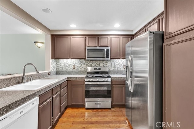 Welcome home to this beautiful Tudor style residence in the community of Three Vines, Ladera Ranch. This beautifully upgraded and spacious townhome is located in one of the most desirable areas of Ladera Ranch. Just steps away from Chaparral Elementary School and Park, and minutes from shopping, this private location offers neighborhood views from your private front yard and patio. Walk down a garden path to your beautiful home. The home features three bedrooms and two and a half baths. Downstairs, gorgeous wood flooring and upstairs, high-quality carpeting, provide a luxurious feel. The upgraded kitchen, complete with granite countertops and stainless steel appliances, opens to the living and dining areas, making it perfect for entertaining. The living room's cozy fireplace adds warmth on cold winter days. The large master bedroom boasts stunning views, an en-suite master bathroom with dual sinks, a shower, a soaking tub, and a spacious walk-in closet. Two additional bedrooms, a second full bathroom, and an upstairs laundry room add to the home's convenience. The oversized two-car garage provides ample storage space. Ladera Ranch offers an exceptional lifestyle with 15 pools, clubhouses, water parks, dog and play parks, miles of hiking and biking trails, tennis and basketball courts, and award-winning schools. The HOA even includes high-speed internet.