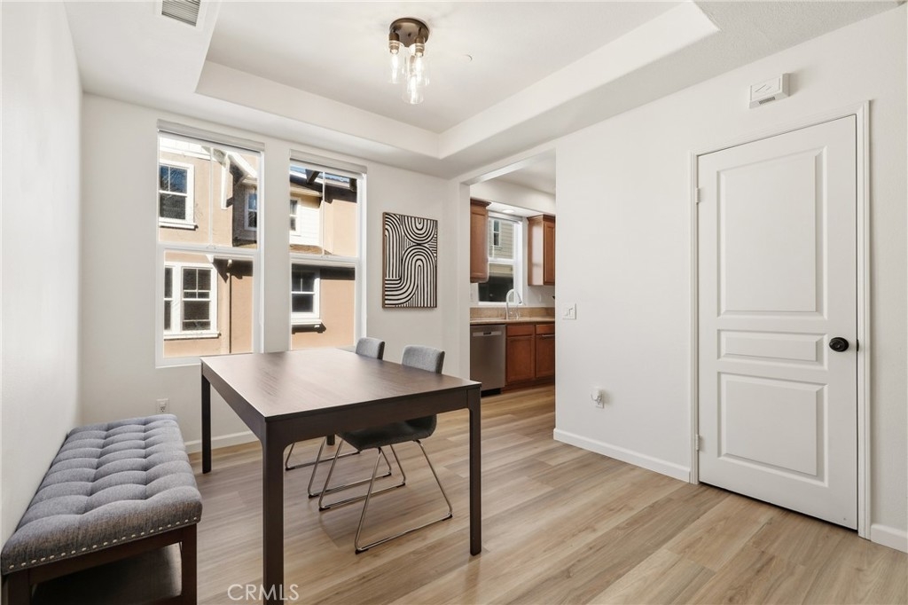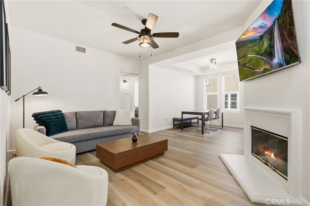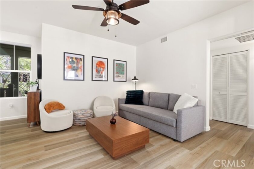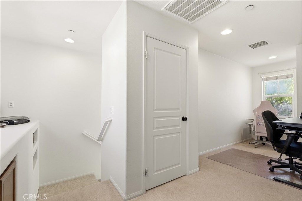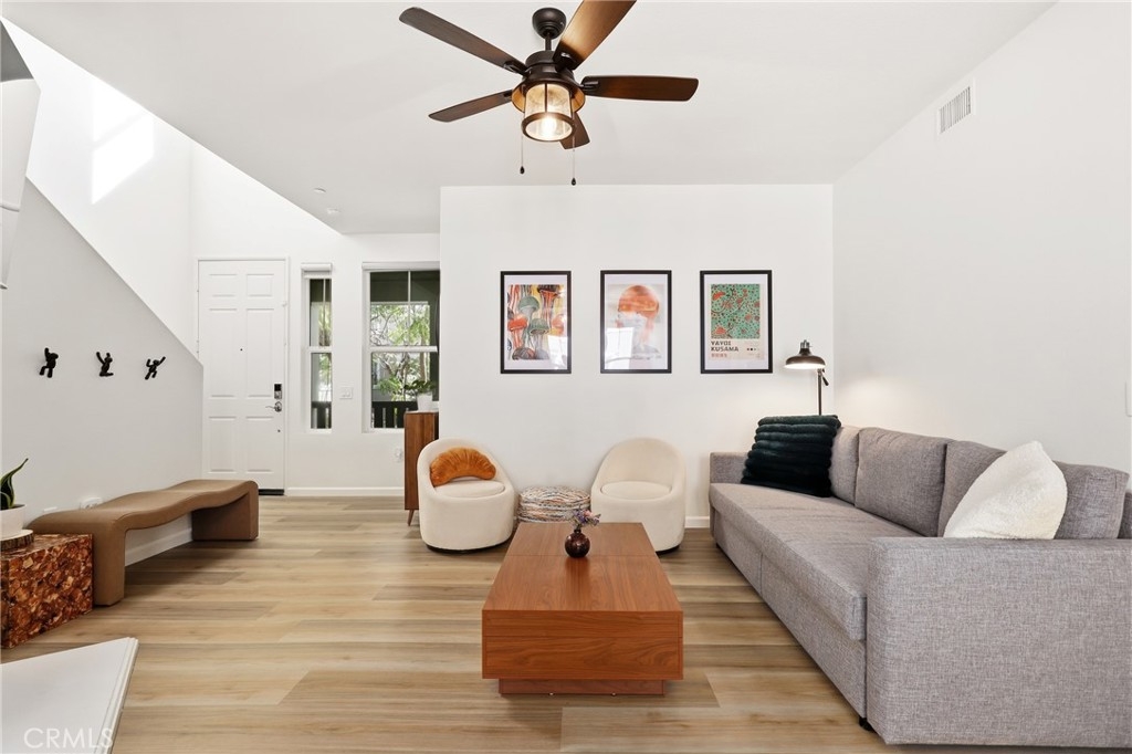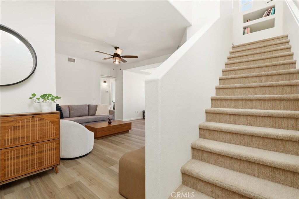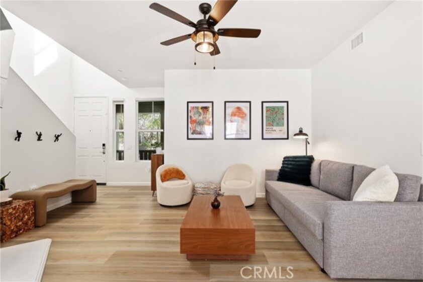 Welcome to this nicely upgraded upper-level carriage unit. This move-in-ready two-bedroom, two-bath home is tucked into a quiet nook of Terramore Village in Ladera Ranch. Stairs leading to the front door bring you to the main level, which is bright, spacious, and ideal for entertaining. This level includes a bedroom, a full bathroom, and a convenient stackable laundry closet. The primary suite is privately situated on the upper level and features an updated en-suite bathroom and a walk-in closet with built-in organizers. A sizeable loft area—currently used as a home office—completes the upper level. Recent upgrades include LVP flooring and a whole-house water softener. The home also comes with a tandem garage with private access, as well as a bonus assigned third parking space. Enjoy this beautiful home along with everything Ladera Ranch has to offer, including resort-style pools, a water park, splash pads, tennis and basketball courts, soccer fields, community gardens, an orange grove, mountain biking and hiking trails, community events, and more.
