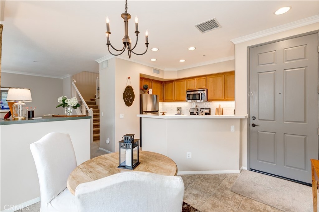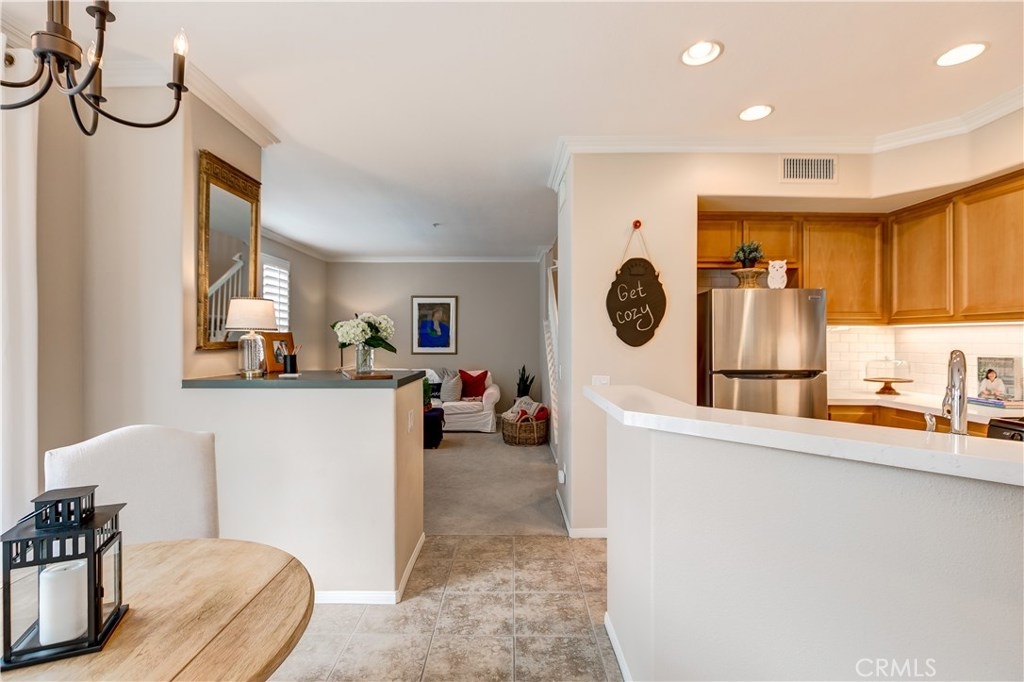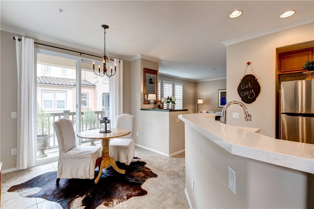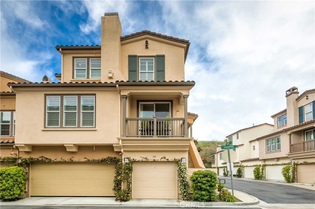 LOWEST PRICE IN LADERA RANCH!! A charming home with a dream location, this end unit in the desirable Sansovino neighborhood welcomes you. Walk into a freshly updated kitchen and nice dining area with a balcony for relaxing on warm summer nights and a living room with a cozy fireplace. Upstairs is a master bedroom and bath as well as a loft that can be either a nursery, bedroom, or home office. The washer and dryer are located upstairs, and everything has been professionally painted. You will have parking for 2 CARS: your private garage and your assigned parking spot. The garage has loads of storage shelves and cupboards. Enjoy living with no one above or below you. Conveniently around the corner are several restaurants, a Starbucks, bagel place, sandwich shop, groceries, drug store, banks, a gas station — everything you need, whether driving or walking. Just up the street is the dog park. And of course, you will also enjoy all Ladera Ranch has to offer: Great schools, library, parks, pools and spas, sport park, trails, and the many celebrations happening all year. Come see for yourself!