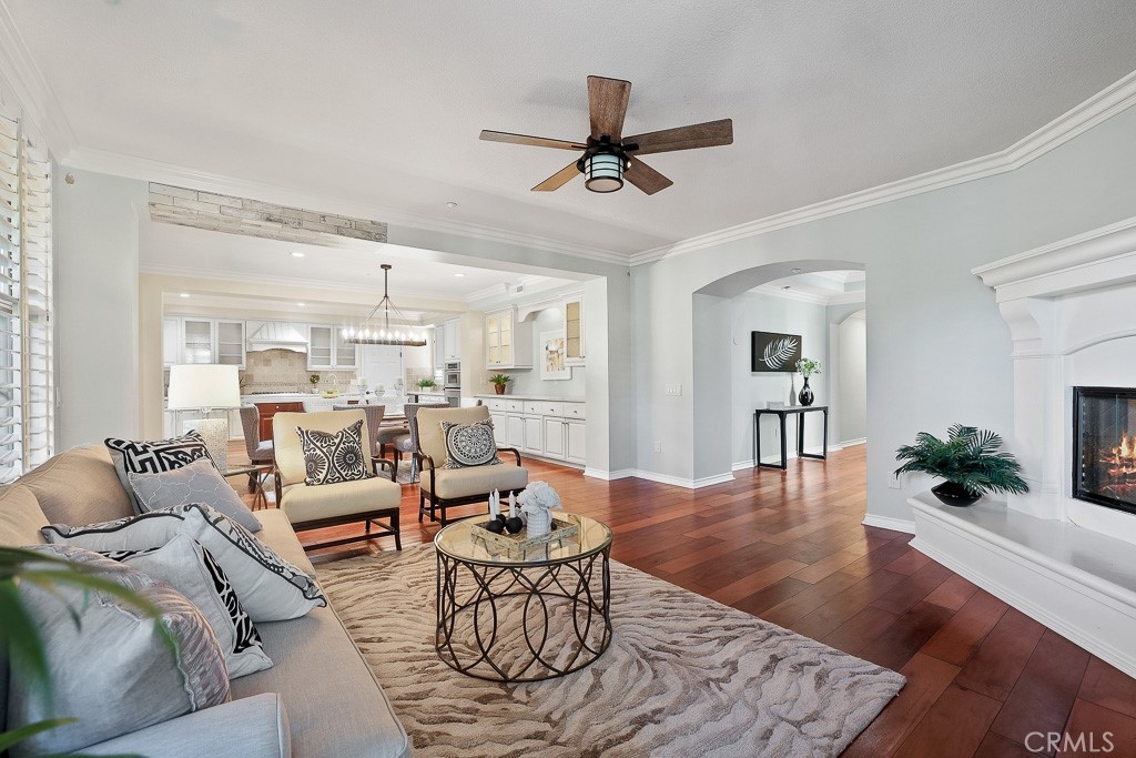 This RARE SINGLE level home is located on a view lot in the prestigious Castellina neighborhood of guard-gated Covenant Hills. Adorned with quality finishes with old world charm and sophistication, this 3 bedroom, 2 bath desirable end location lives and feels like a luxurious house. With its wrap-around premium view lot with, spacious loggia, built-in BBQ, firepit, fountain, citrus trees, flowers, and grassy area defines al’fresco living. Inside you will find an ideal floorplan and amenities including wide plank hardwood floors, crown molding, custom shutters, and fresh designer paint. A spacious family room with entertainment center and grand fireplace connect to the updated kitchen with large center island, new stainless appliances, wine chiller, built-in cabinetry and finished with leathered Taj Mahal quartzite. The sumptuous master bedroom boasts custom wall accents, chandelier, and French door access to the rear patio. The master bath includes walk-in customized closet, soaking tub, separate shower, and dual sinks. Secondary bedroom has walk-in closet and designer wall coverings. 3rd bedroom (or den) includes built-in nook with bed and custom bookshelves, custom desk and library wall. The inside laundry offers ample storage and customized linen closet in the hallway. Amazing amenities including the nearby clubhouse with pool, tennis courts toddler pool, kitchen, library, outdoor grill, and large grass area plus the many trails, parks and more! Offers encouraged!